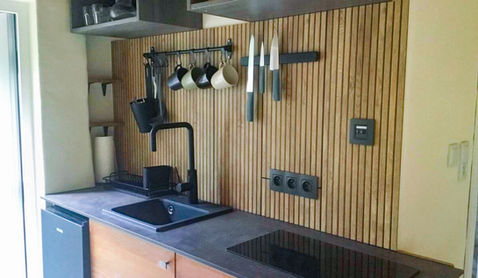 Ein Zimmer mit offener Küche, Bad und Außenterrasse. Der Garten draußen ist wild, um Wildtiere und Bestäuber anzulocken.